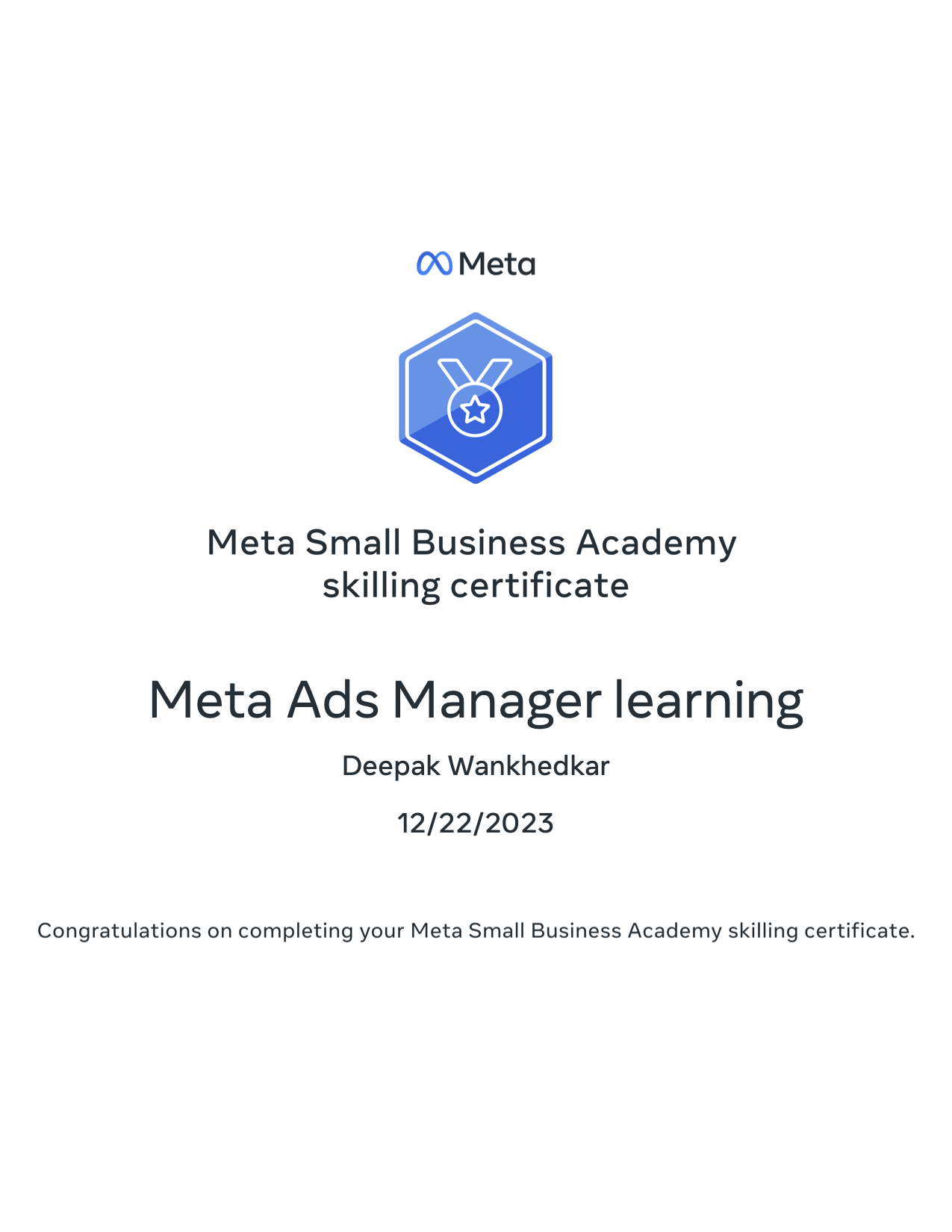 Meta Small Business Academy skilling certificate - Meta Ads Manager Learning